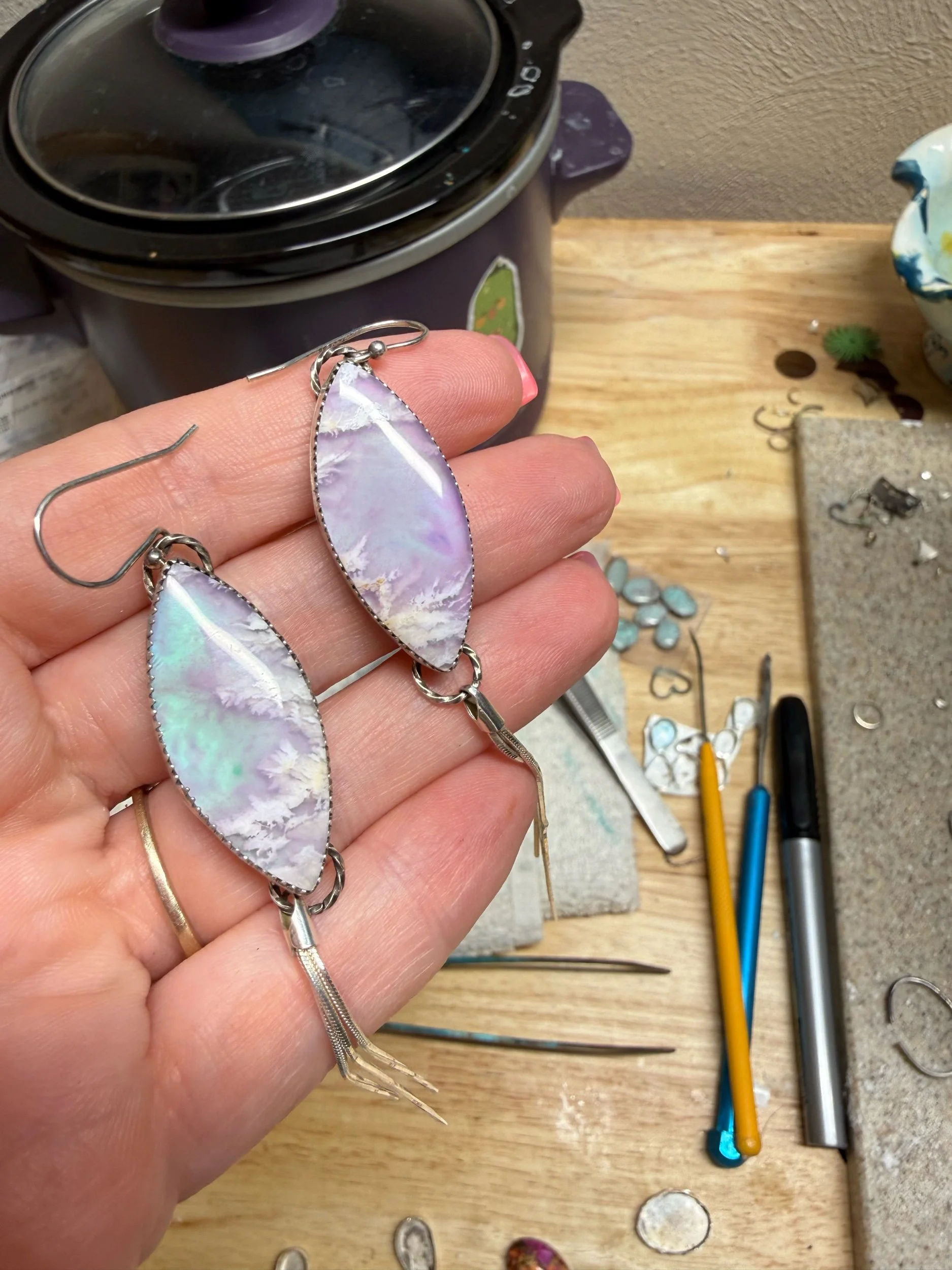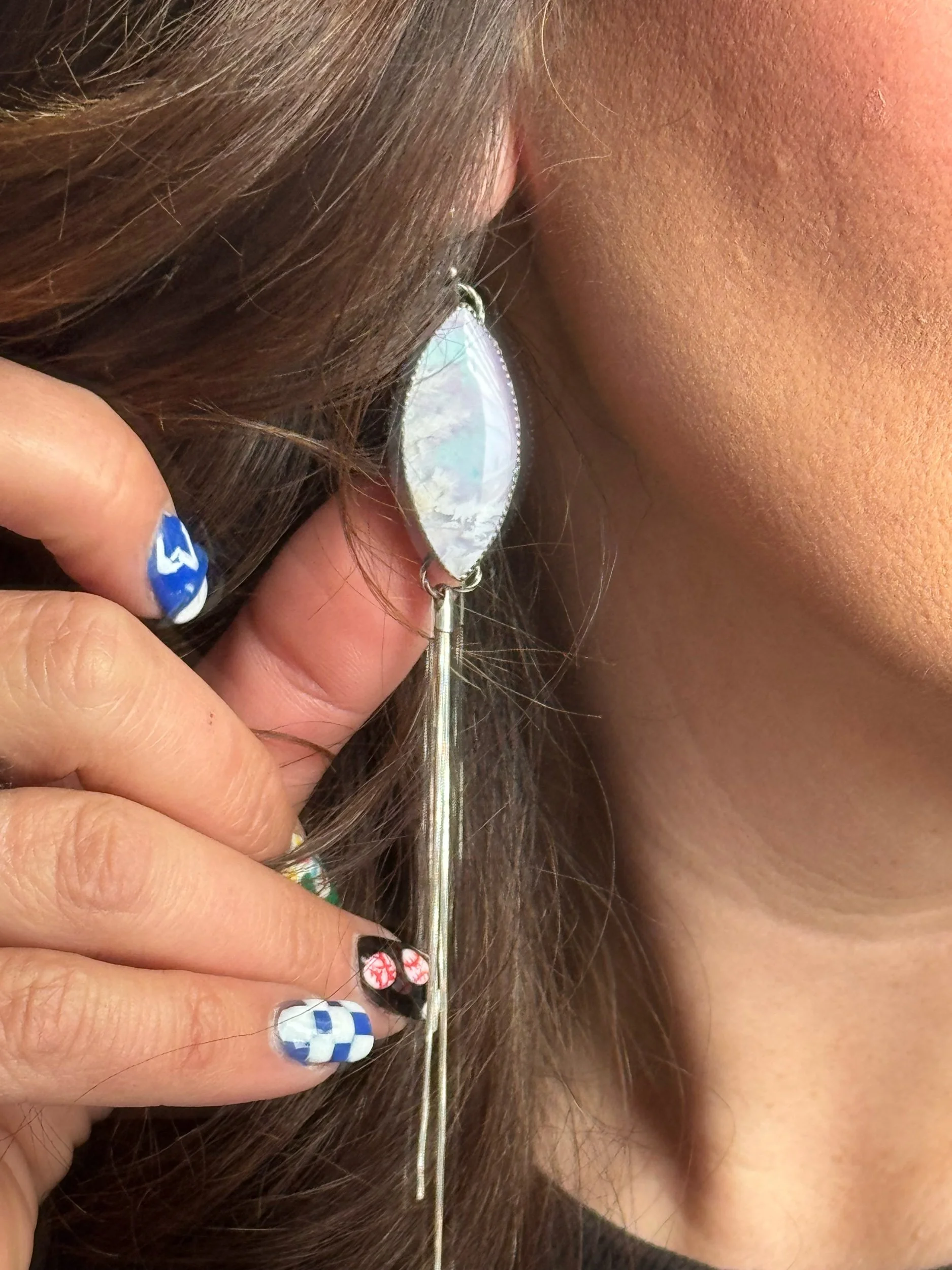 The color in these Aurora Opals are mesmerizing. A triple strand of snake chain sparkles just setting these earrings off! Dress them up or thrown on with an everyday outfit. Can’t go wrong.